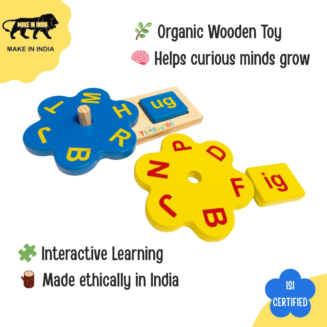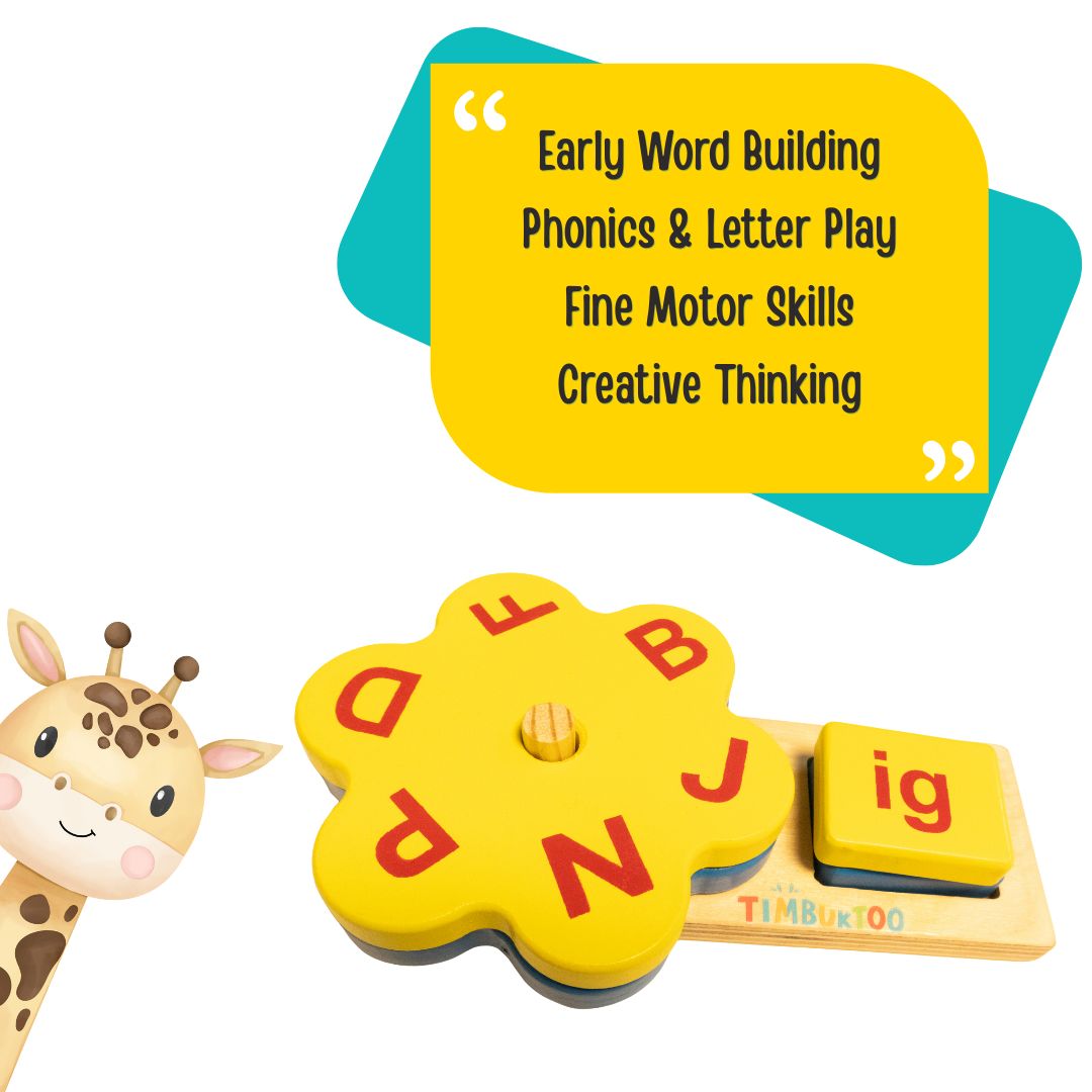 • Rotating flower-shaped wheels with letters + word tiles to mix and match