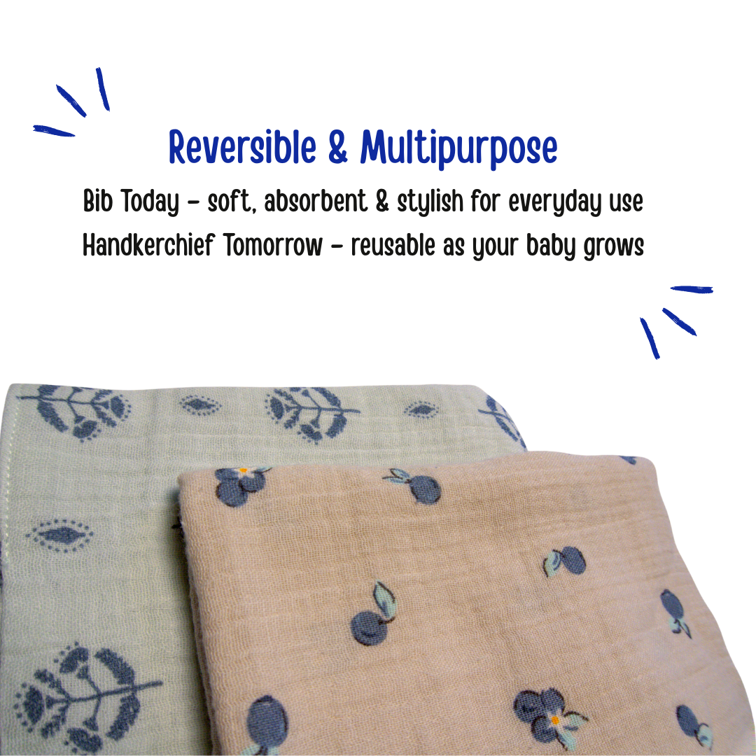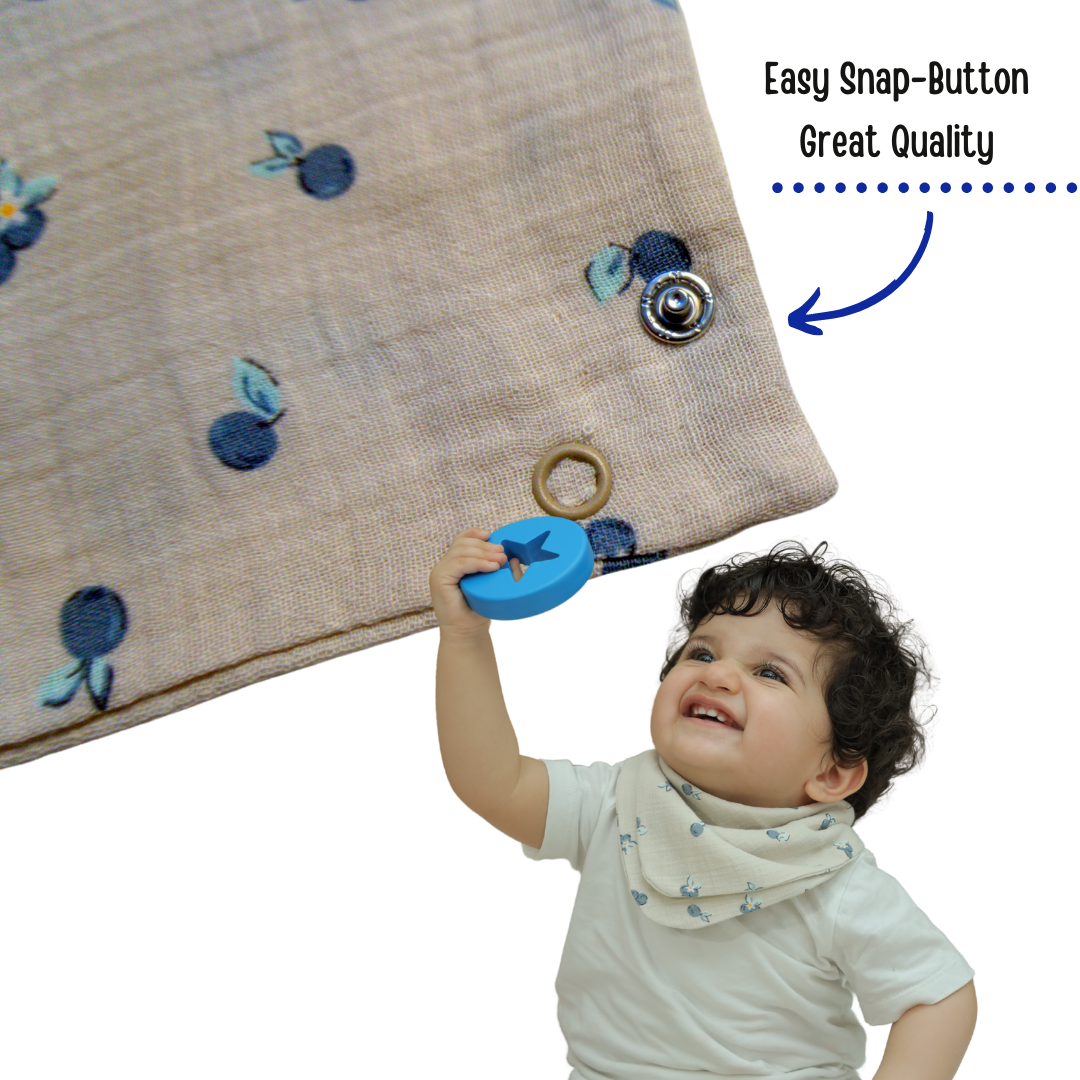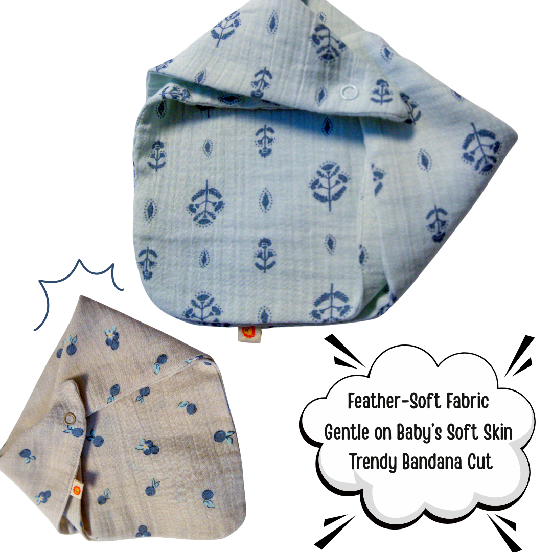 Made from 100% premium organic muslin cotton, they are double-layered, ultra-soft, and breathable, keeping your baby comfortable and mess-free. The bandana-style cut adds a stylish touch, while the adjustable snaps mean theyβll grow with your baby and later double up as a handy handkerchief.