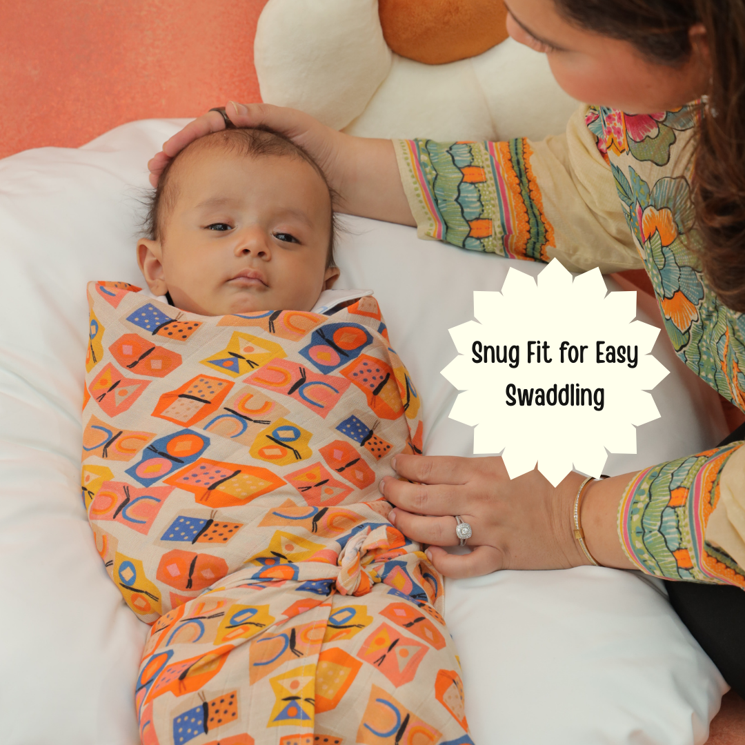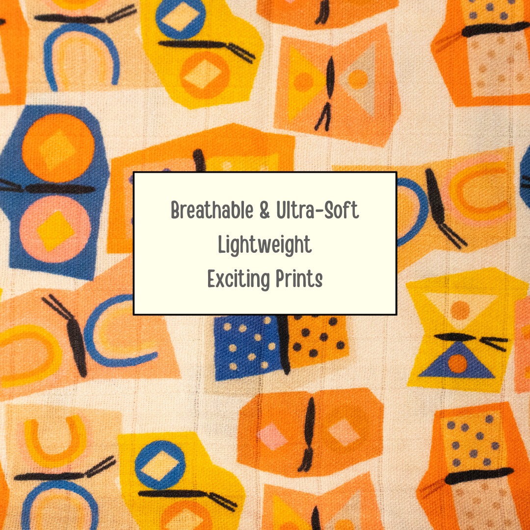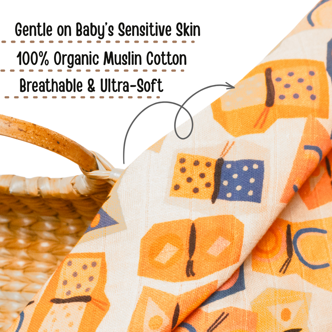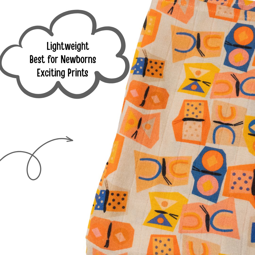Add a splash of color and creativity to your baby’s essentials with our Butteroo swaddle. Crafted in premium muslin cotton, this ultra-soft and breathable wrap features a vibrant mix of geometrical butterfly shapes and playful patterns in bright hues of orange, yellow, purple, and blue.