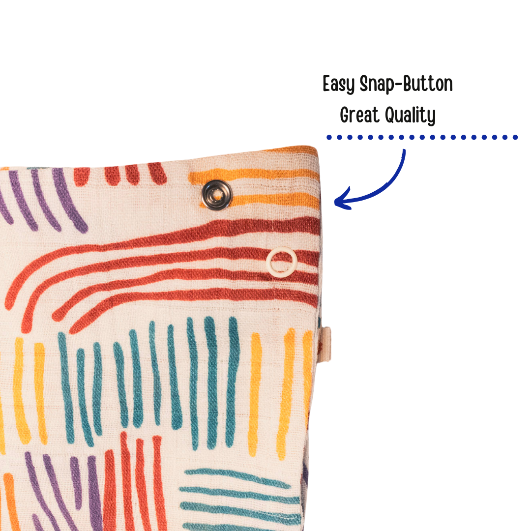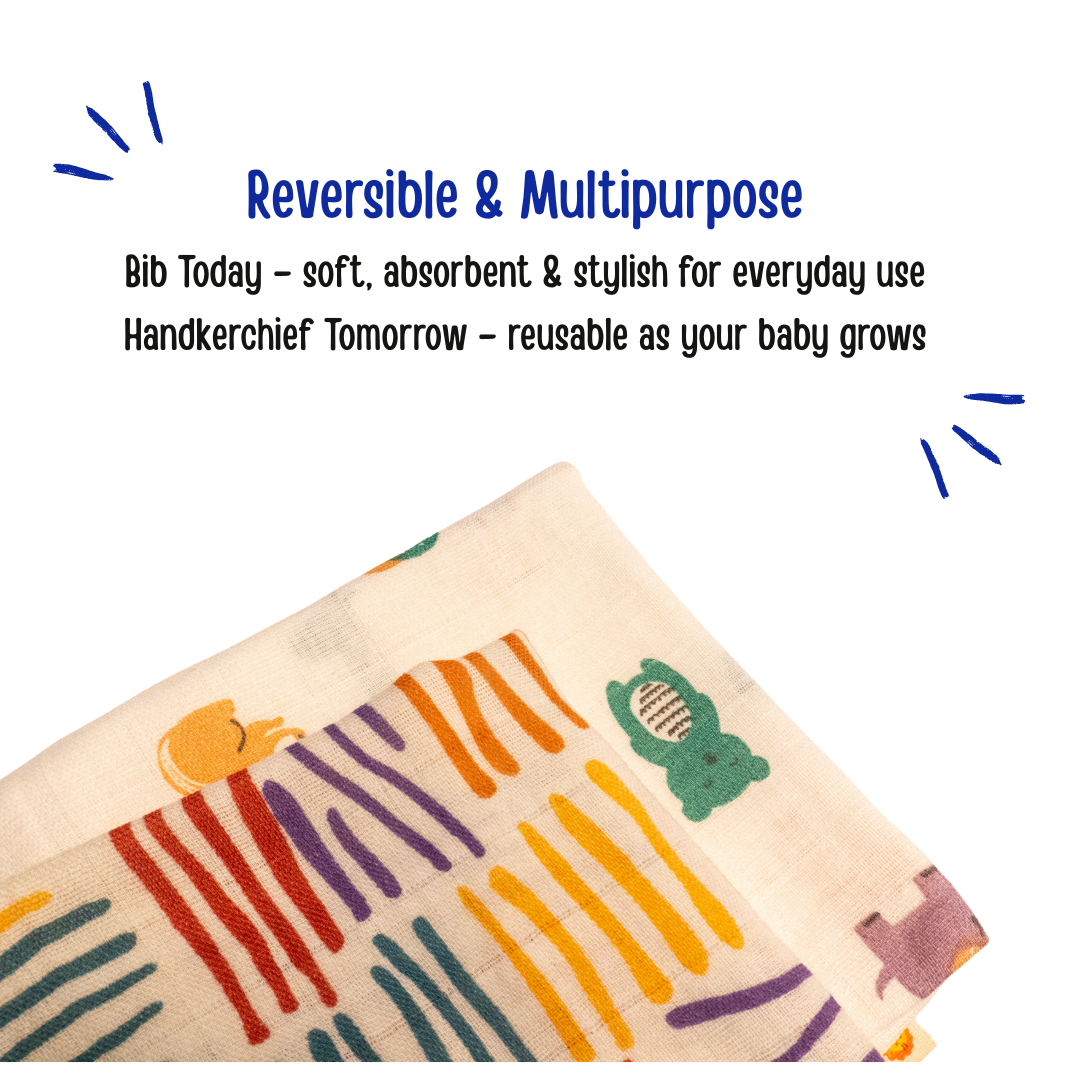Crafted from 100% premium organic muslin cotton, they are double-layered for extra absorbency, ultra-soft on sensitive baby skin, and breathable enough for all-day wear. With adjustable snap buttons, these bibs grow with your baby and later double up as handkerchiefs, making them a versatile essential.