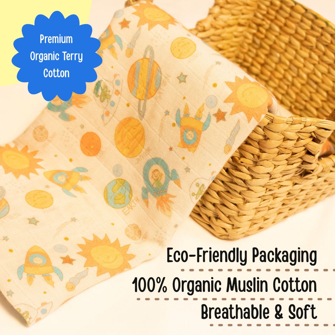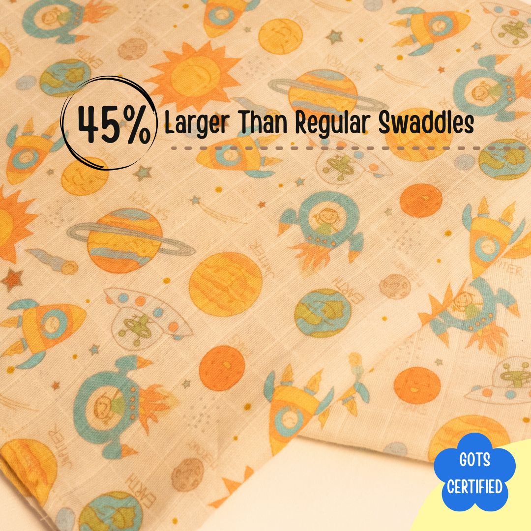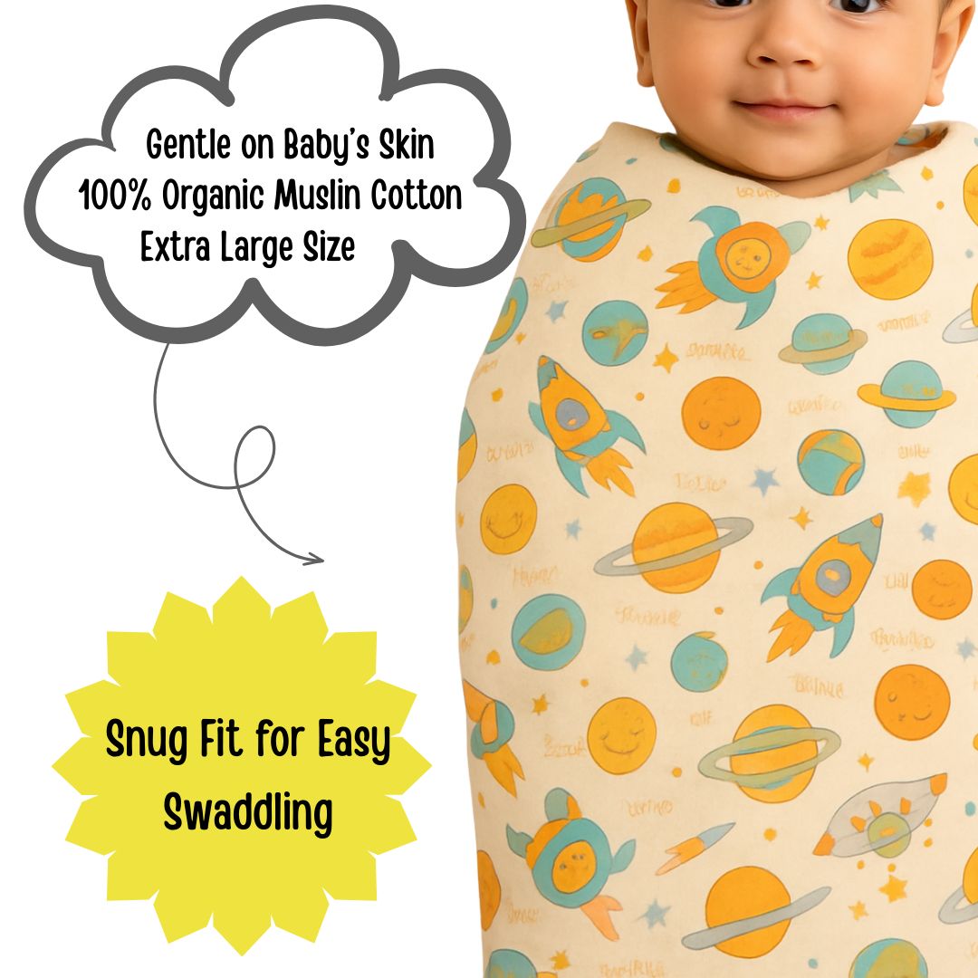 Snuggle your little one in imagination and joy with our Space & Butteroo swaddle duo. Crafted in ultra-soft, breathable muslin cotton, these swaddles are 45% larger than the usual size, giving your baby extra comfort and parents extra versatility.