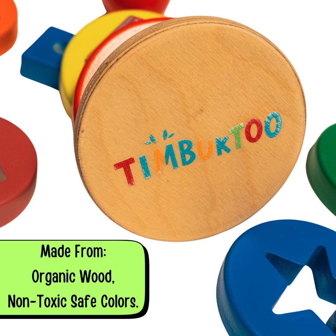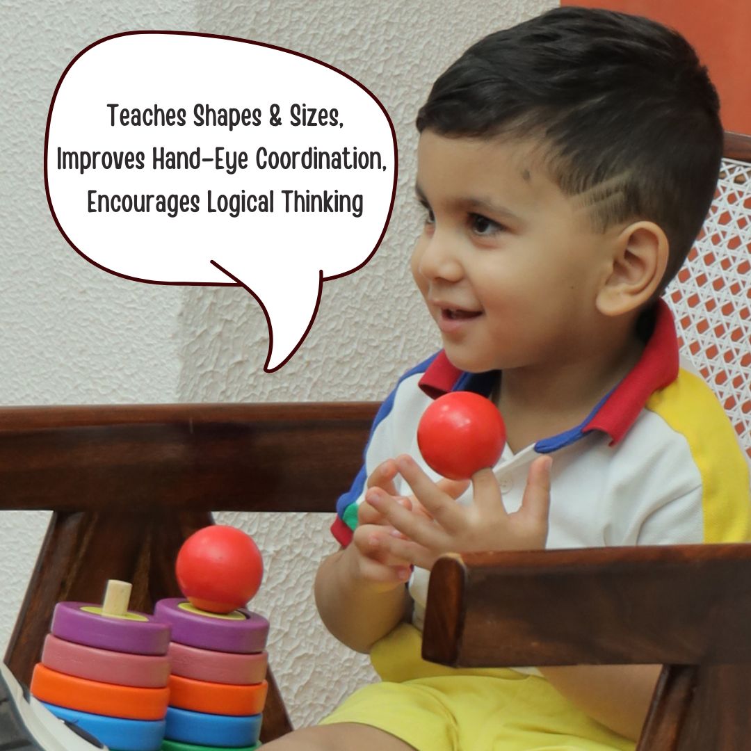 • Montessori Match & Stack Tower with 6 colorful rings & shapes